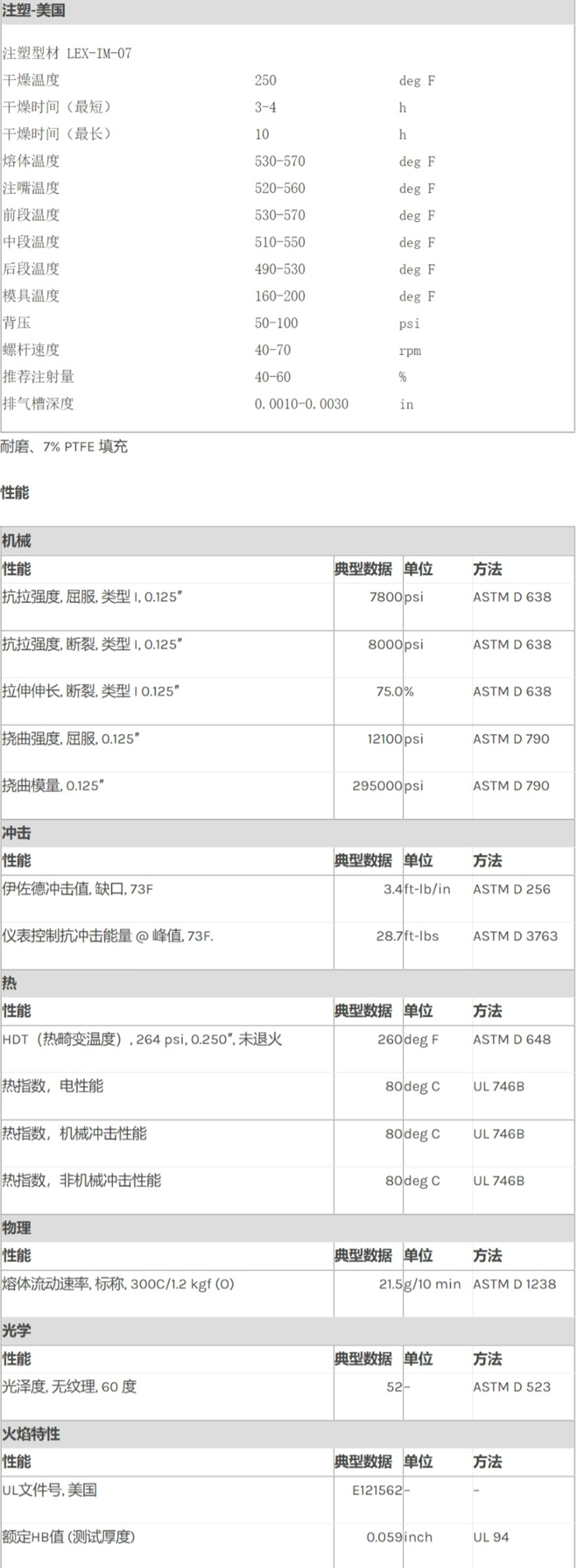 应用范围:产品描述Lexan PC WR5210R物性表耐磨、7% PTFE 填充加工