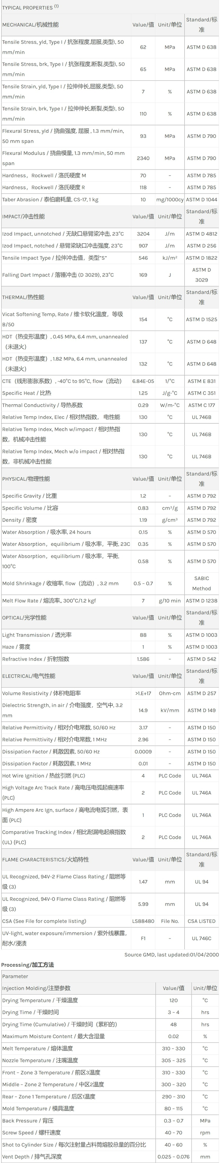 “Lexan 203 resin是一种聚碳酸酯(PC)产品,它可以通过注射成型进行加工,典型应用领域为:户外应用。