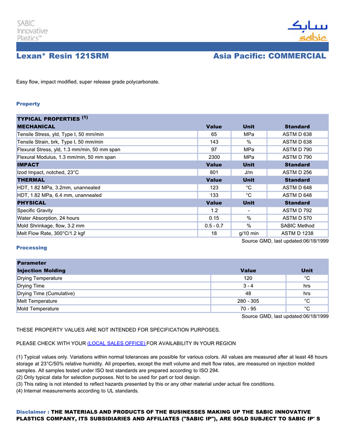 应用范围:产品描述Lexan PC 121SRM物性表Lexan 121SRM resin是一种聚碳酸酯(PC)材料,该产品加工方式为:注射成型。主要特性有:冲击改性、优良的脱模剂。相关颜色色号:121SRM-888、121SRM-YW7G042、121SRM-70221、121SRM-50503、121SRM-70354、121SRM-GY5C201Easy flow, impact modified,