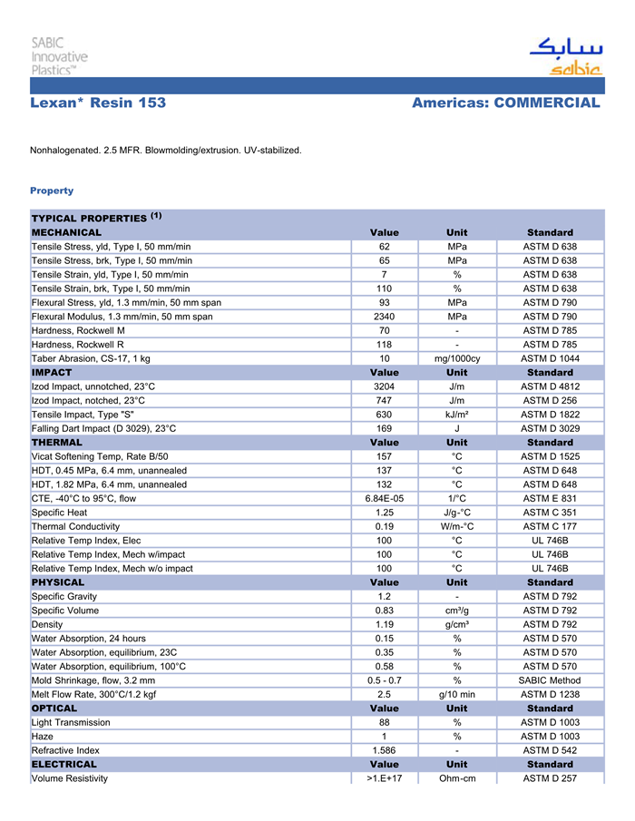 应用范围:产品描述LEXAN PC 153物性表非卤化物。熔体流动速率MFR:2.5。吹塑、挤塑级。紫外稳定相关色号:153-111