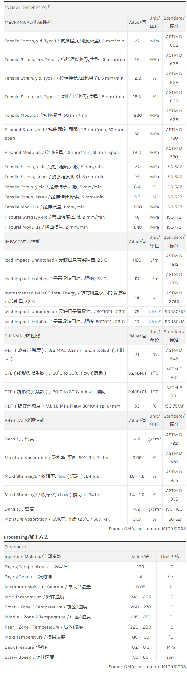 应用范围: 产品描述 LNP Thermocomp WH0420A_GY5A749物性表 LNP THERMOCOMP WH0420A_GY5A749是一种聚丁烯对苯二甲酸酯(PBT)产品,可以通过注射成型进行加工。 4.2 Specific Gravity / 比重, PBT, gray Property/特性