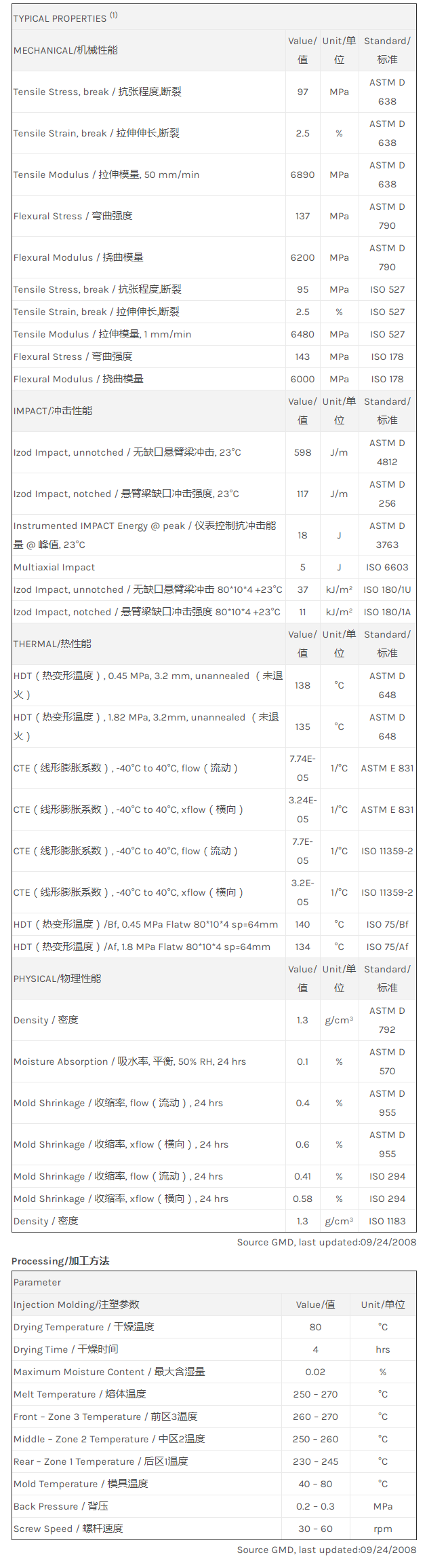 应用范围: 产品描述 LNP Thermocomp NF004物性表 LNP THERMOCOMP NF004是一种聚碳酸酯+丙烯腈丁二烯苯乙烯(PC+ABS)产品,含有的填充物为20%玻璃纤维增强材料,可以通过注射成型进行加工。 相关颜色色号:NF004-GYLTNAT LNP* Thermocomp* NF004 is a compound based on PC+ABS Blend resi