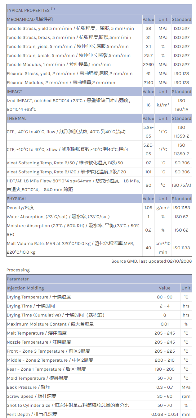应用范围:产品描述CYCOLAC ABS EXCC0009物性表High Flow, Low gloss ABS for unpainted interior applications.