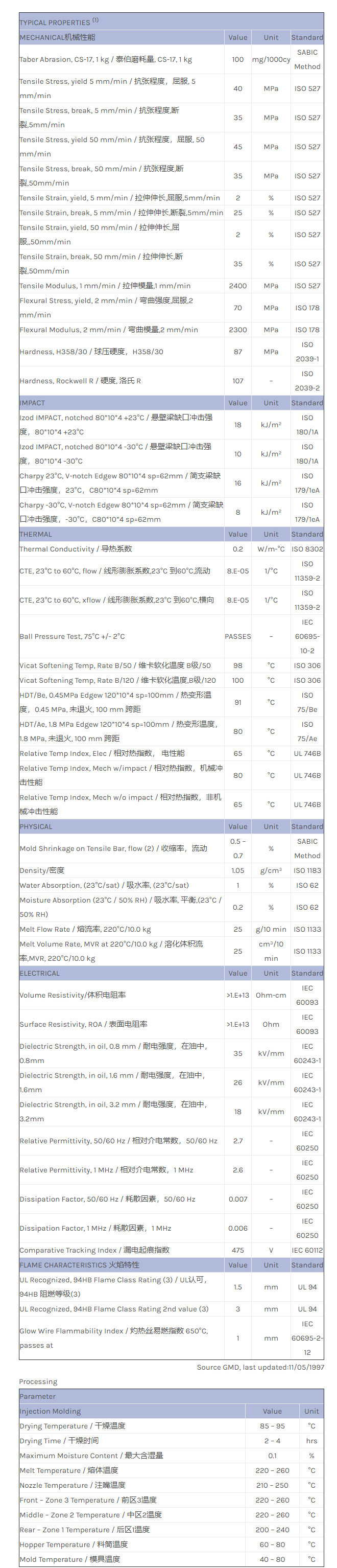 CYCOLAC GPM5500T is a multi purpose injection moulding grade, equal to GPM5500 but equiped with a high loading of anti static agents, providing a favourable balance of engineering properties.