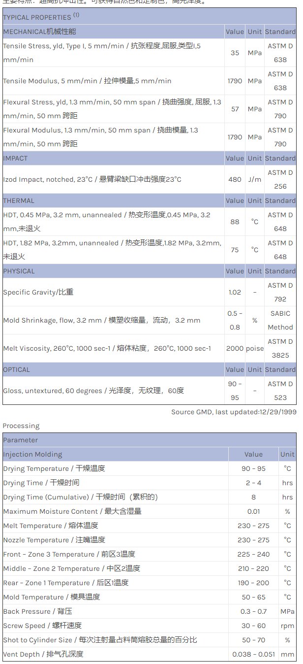 CYCOLAC ABS GPT3800物性表