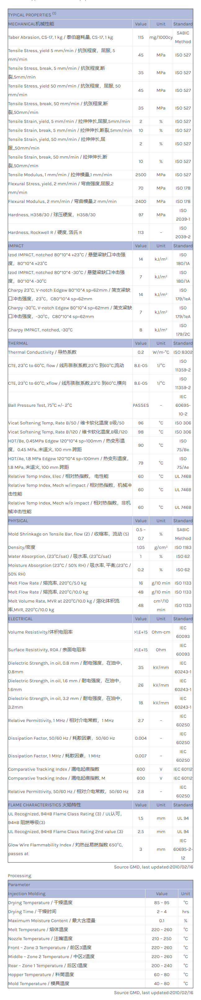 应用范围:产品描述CYCOLAC ABS S701SU物性表CYCOLAC S701SU is an ABS with improved UV resistance, providing a superior balance of properties. Its wide processing window, excellent flow and good MECHANICAL机械性能 properties