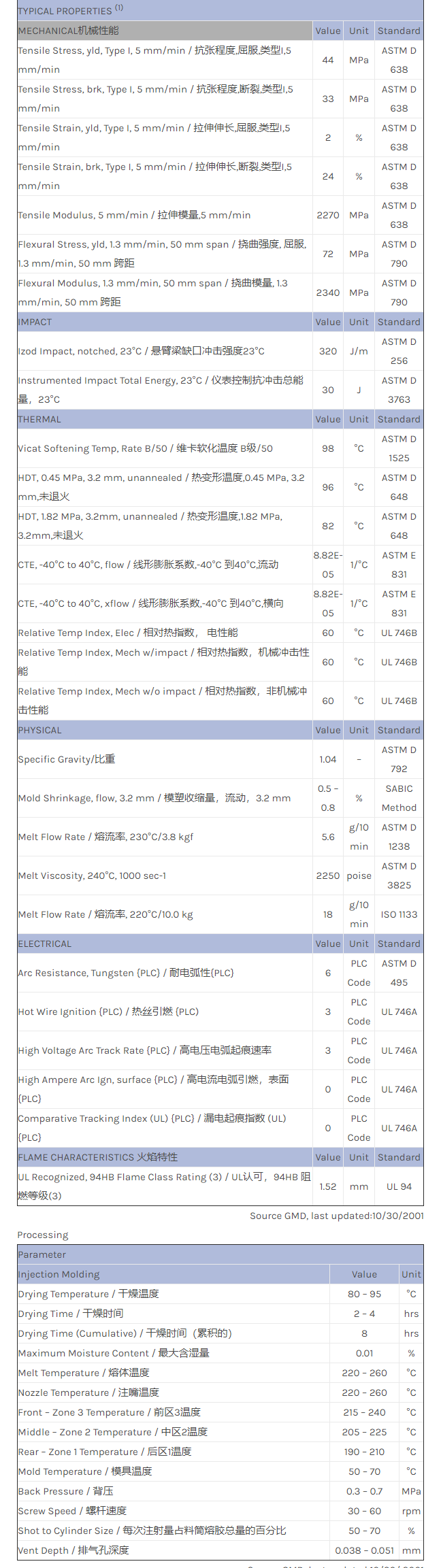 应用范围:产品描述CYCOLAC ABS MG47物性表Cycolac MG47 是一种丙烯腈丁二烯苯乙烯(ABS)产品,可以通过注射成型进行加工。典型应用领域为:汽车行业。主要特性为:阻燃/额定火焰。相关色号:MG47-BL7C043、MG47-4266、MG47-BK4500、MG47-92428S、MG47-NA1000、MG47-BL1C035、MG47-GY6A218、MG47-2P1D008、M