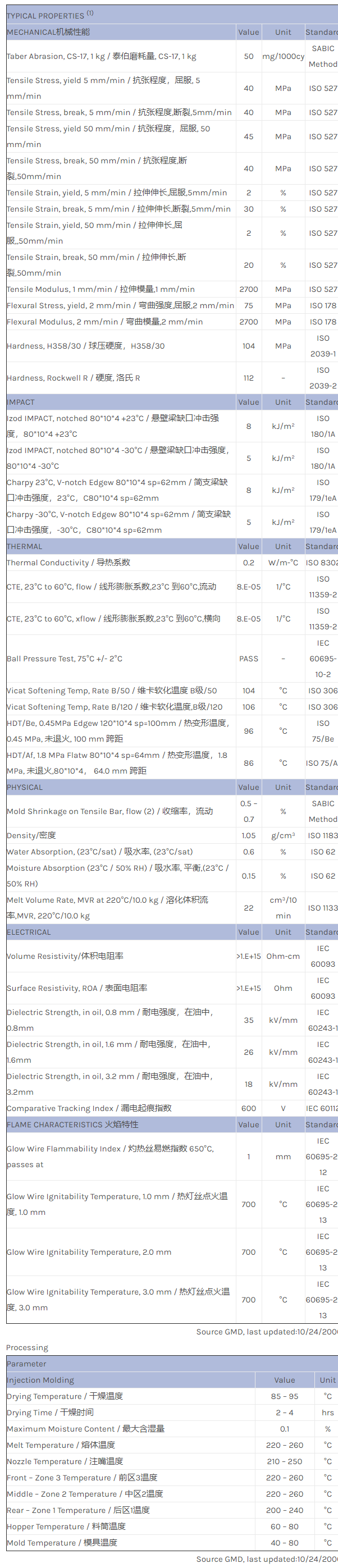 CYCOLAC ABS S708C物性表