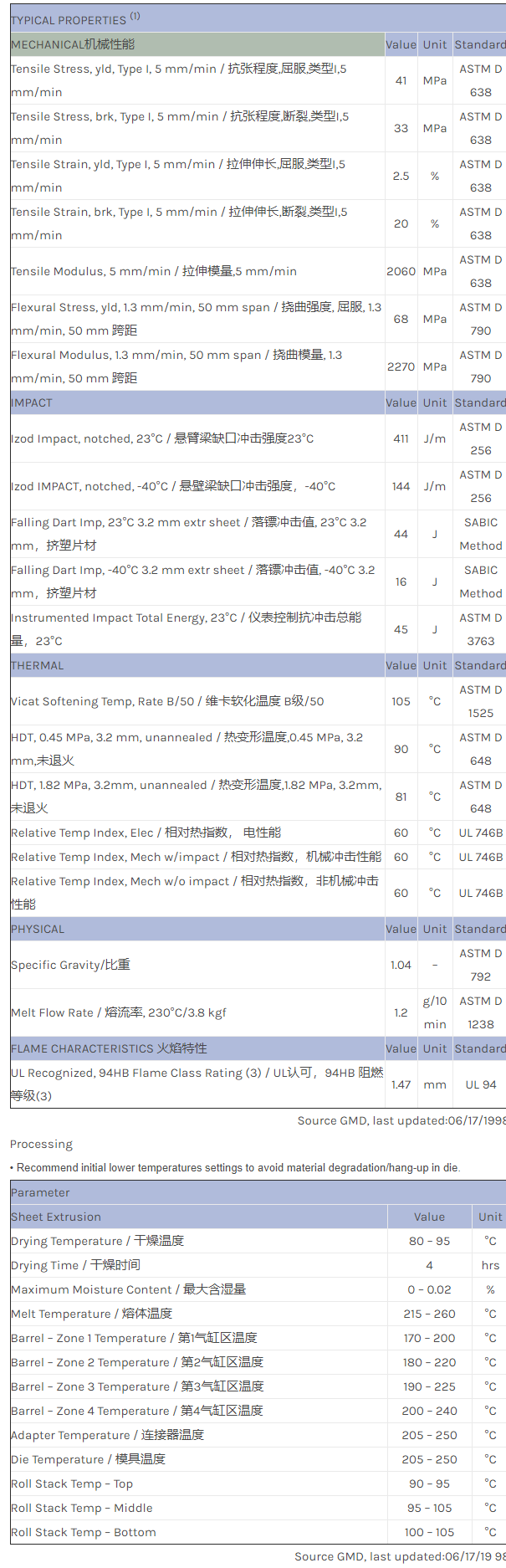 应用范围:产品描述CYCOLAC ABS HXS物性表ABS, high flow, sheet extrusion grade with medium IMPACT.