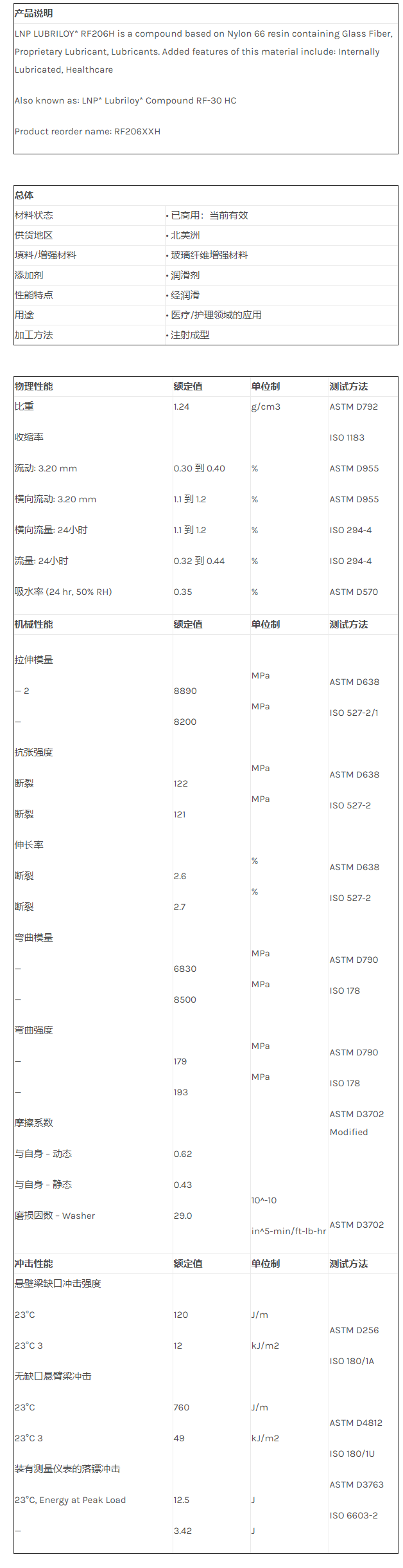 应用范围: 产品描述 LNP Lubriloy RF206XXH物性表