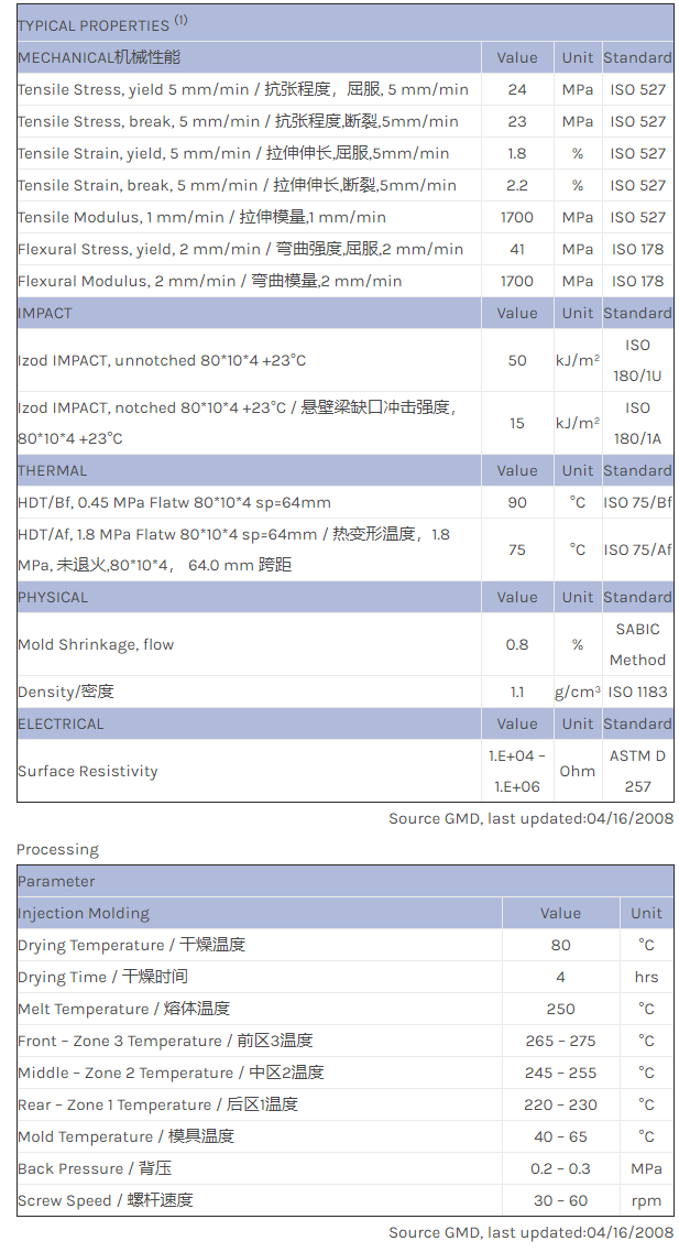 江门LNP STAT-KON CX99000是一种高抗冲聚苯乙烯材料,含有的填充物为炭粉,加工方式为:注射成型。