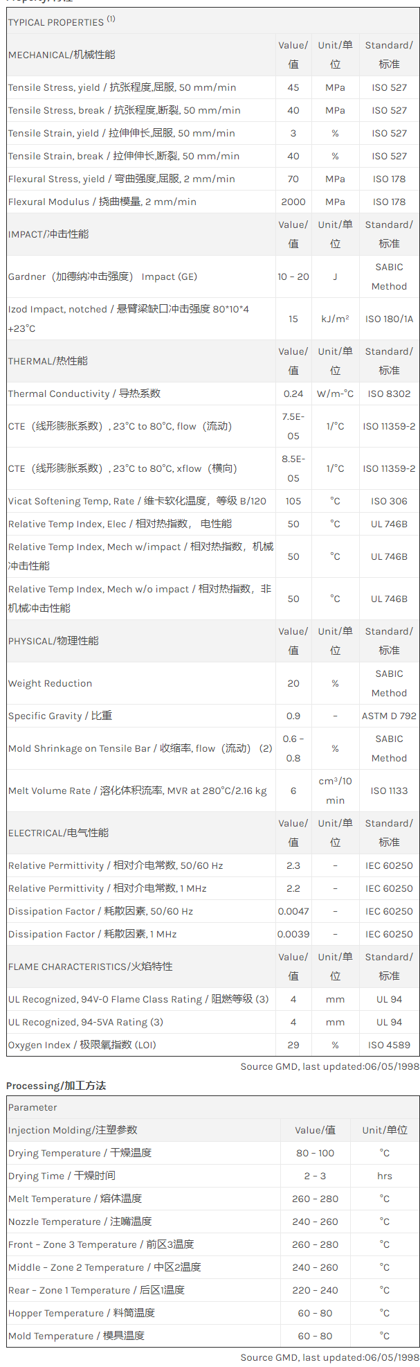 应用范围:产品描述Noryl PPO FN150物性表“NORYL FN150 resin是一种聚苯醚+PS(PPE+PS)材料,加工方式为:注射成型。主要特性有:阻燃/额定火焰通过 ROHS 认证典型应用领域包括:电气/电子应用泡沫商业/办公用品“。相关颜色色号:FN150-GY7E322、FN150-GY4722NORYL FN150 twin wall foam meets UL standard 9
