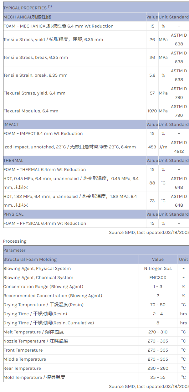 应用范围:产品描述NORYL PPO FN850物性表PRELIMINARY DATA. Eco-flo, foamable resin. All properties at 15% weight reduction; 0.250″ thick test specimens.