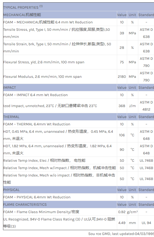 应用范围:产品描述NORYL PPO PX5606物性表SINGLE LOT DATA: 0.250″ bar thickness/10% weight reduction.