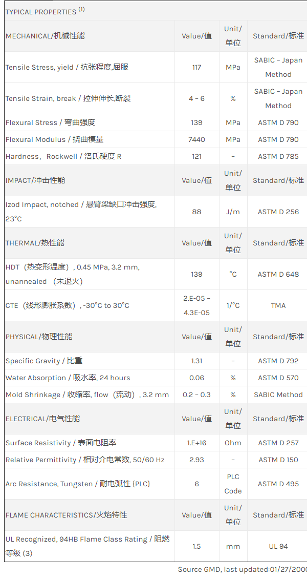 应用范围:产品描述Noryl PPO GFN3L物性表“NORYL GFN3L resin是一种聚苯醚+PS(PPE+PS)材料,含有的填充物为30%玻璃纤维增强材料。主要特性有:阻燃/额定火焰水解稳定性”相关颜色色号:GFN3L-701Property/特性