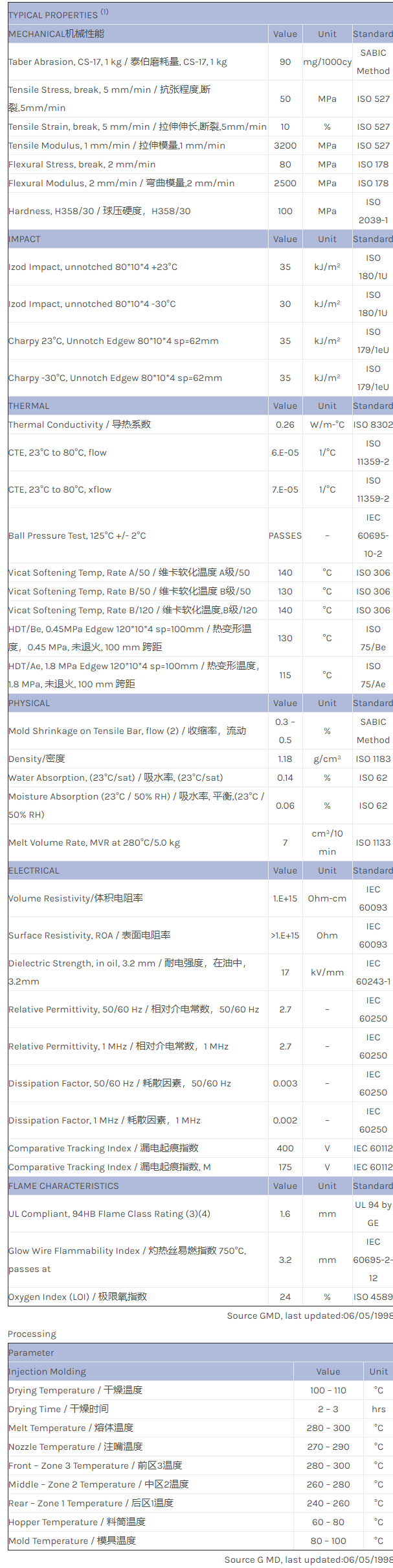 应用范围:产品描述NORYL PPO HB1525物性表NORYL HB1525 is a 15 % short glass fibre reinforced material with a HDT/A of 115ºC according ISO 75. NORYL HB1525 is an easy flow material designed for applications where dimens