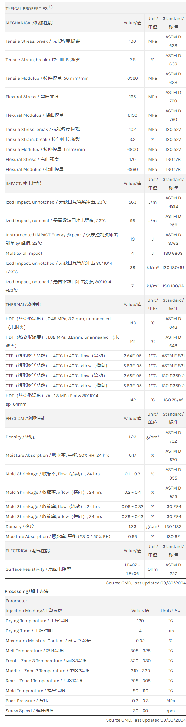 应用范围: 产品描述 LNP Statkon DE002ER物性表 “LNP STAT-KON DE002ER是一种聚碳酸酯(PC)产品,含有的填充物为10%碳纤维增强材料,可以通过注射成型进行加工。 特性包括: 传导性 加工性能良好 脱模剂 优良的脱模剂” LNP STAT-KON* DE002ER is a compound based on Polycarbonate resin c