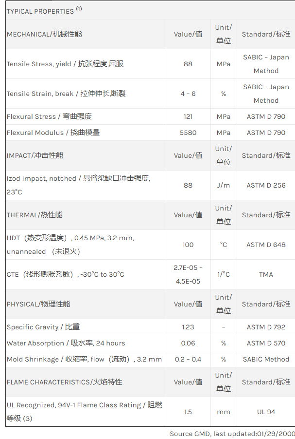 应用范围:产品描述Noryl PPO S100G20物性表NORYL S100G20 resin是一种聚苯醚+PS(PPE+PS)材料,主要特性为:阻燃/额定火焰。相关颜色色号:S100G20-BK1066、S100G20-BL6275、S100G20-GY7B200、S100G20-GN7G038Property/特性