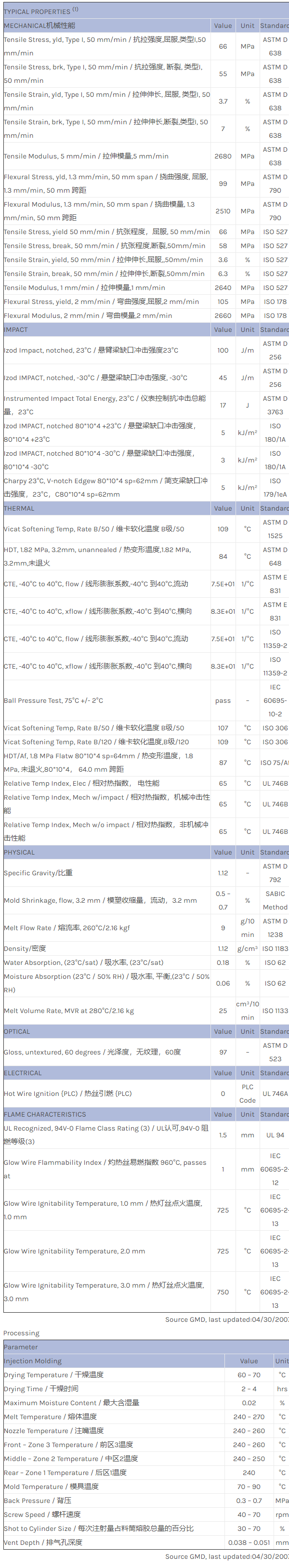 应用范围:产品描述NORYL PPO FXN2090H物性表Noryl* FXN2090H resin is an unfilled, injection moldable grade. Designed for exceptionally high gloss and improved pencil hardness vs. standard Noryl grades, FXN2090H resin us