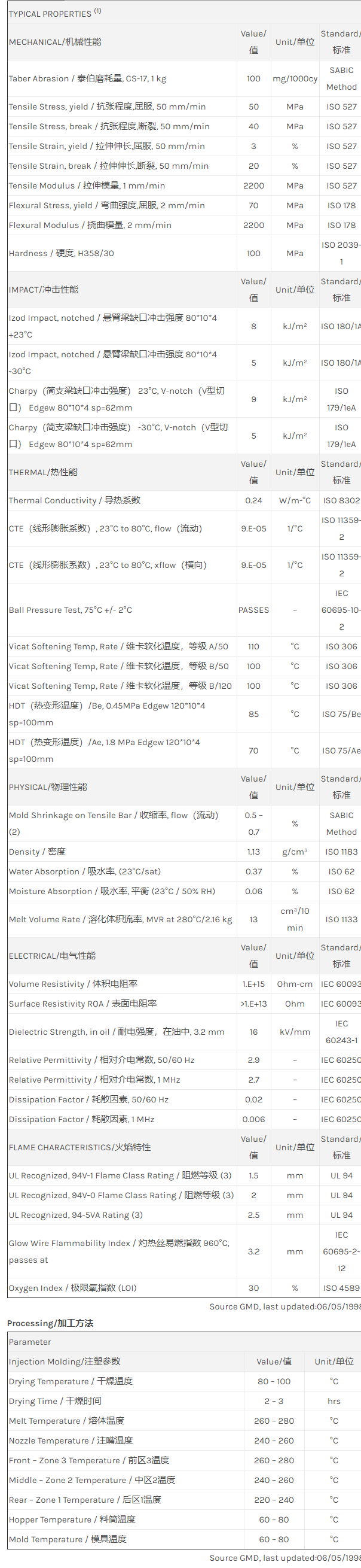 Noryl PPO HF185物性表