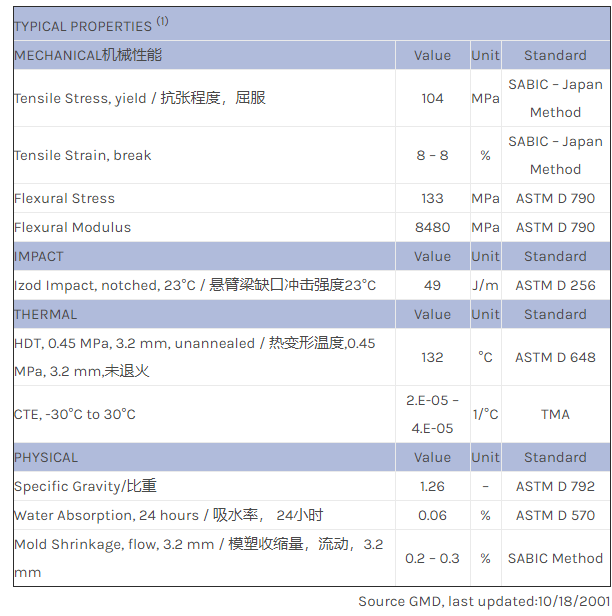 应用范围:产品描述NORYL PPO HMC3008物性表
