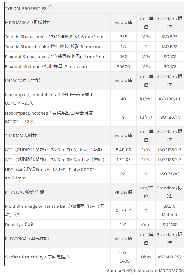 应用范围: 产品描述 LNP Statkon UEF26AS物性表 “LNP STAT-KON UEF26AS是一种聚二甲苯酰胺(PPA)材料,含有的填充物为玻璃、碳纤维增强材料,加工方式为:注射成型。 LNP STAT-KON UEF26AS的主要特性有: 通过ROHS认证 传导性” LNP* Stat-kon* UEF26AS is a compound based on Polyphth