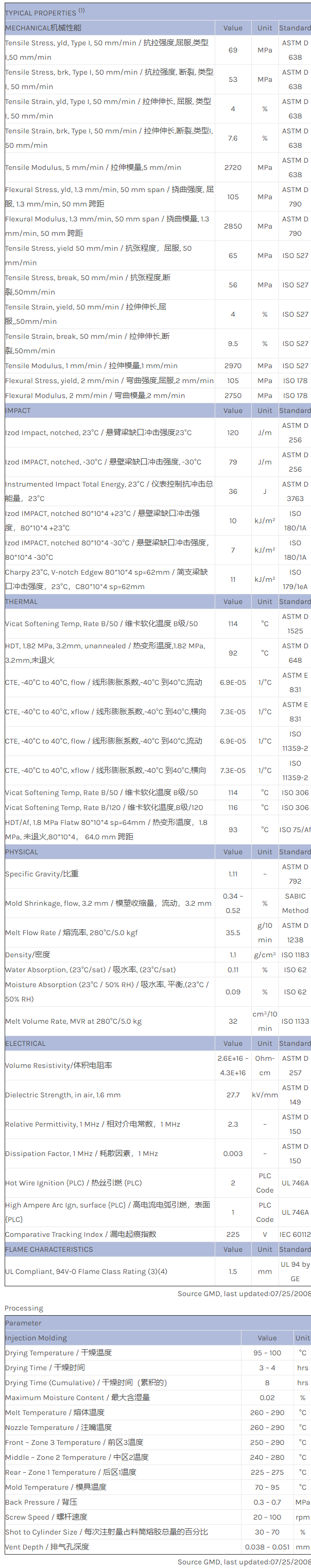 应用范围:产品描述NORYL PPO NH3060物性表NH3060 resin is a modified PPE + PS blend with an excellent balance of non-halogenated flame retardance, hydrolytic stability, impact and heat resistance, good flow, and low Spe