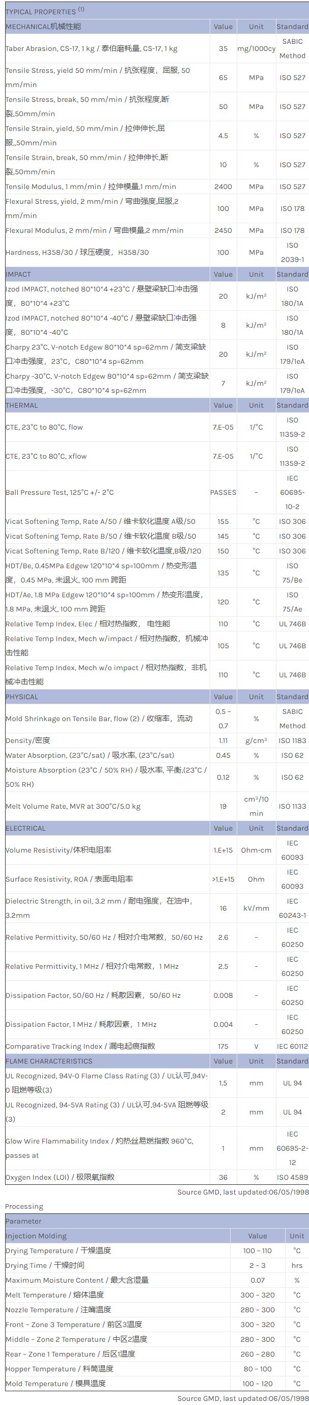 Noryl PO2209 is an unfilled flame retardant material with a Vicat B/120 of 150 ºC. According to own measurements PO2209 is V0 at 1.6mm