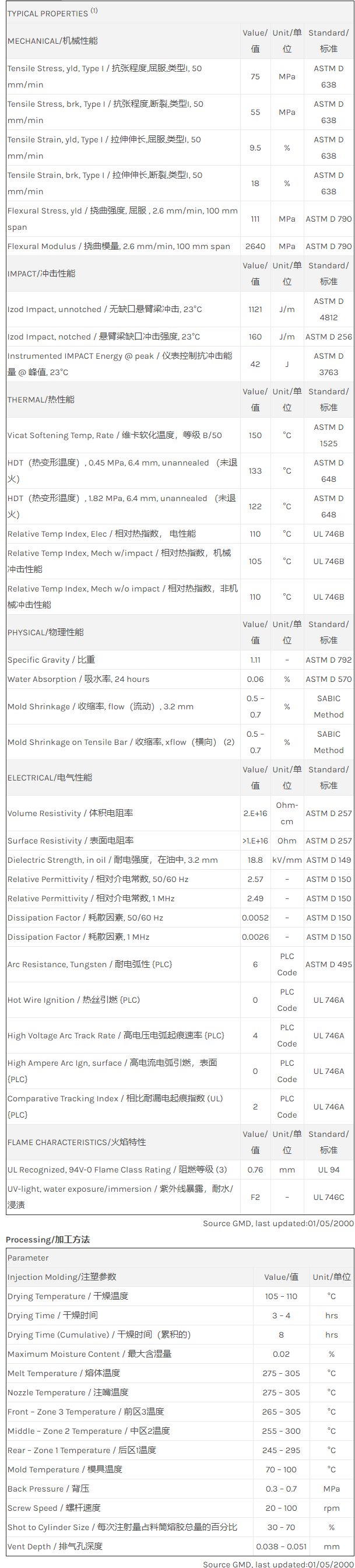 非溴化、非氯化、阻燃。改良的生产率与可靠性。HDT(热畸变温度):252F。 UL94 V-0 额定。电力应用。