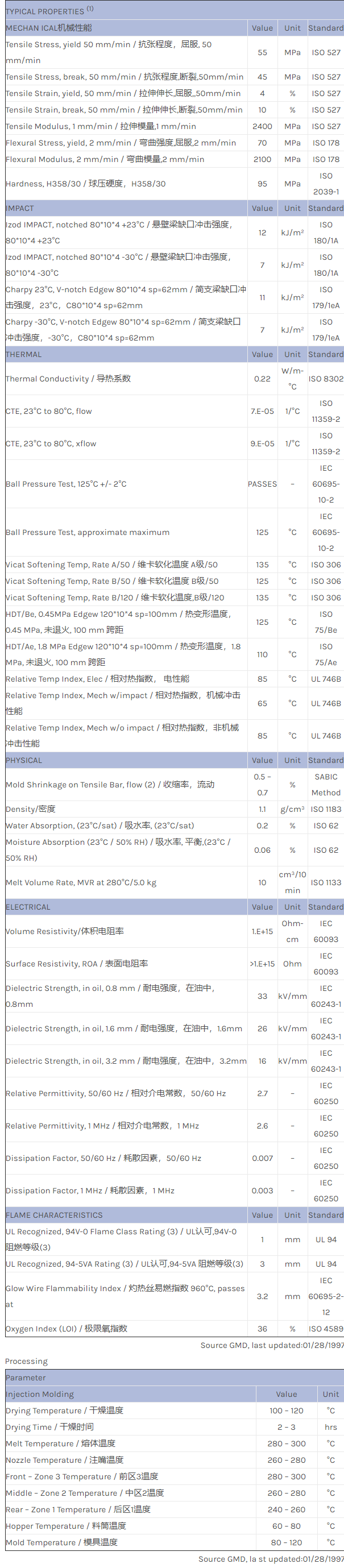 应用范围:产品描述NORYL PPO PX9406N物性表Noryl PX9406N is an unfilled, halogen free (according VDE/DIN 472 part 813) flame retardant material with medium heat resistance. This material is V0 at 1.0 mm according to UL9
