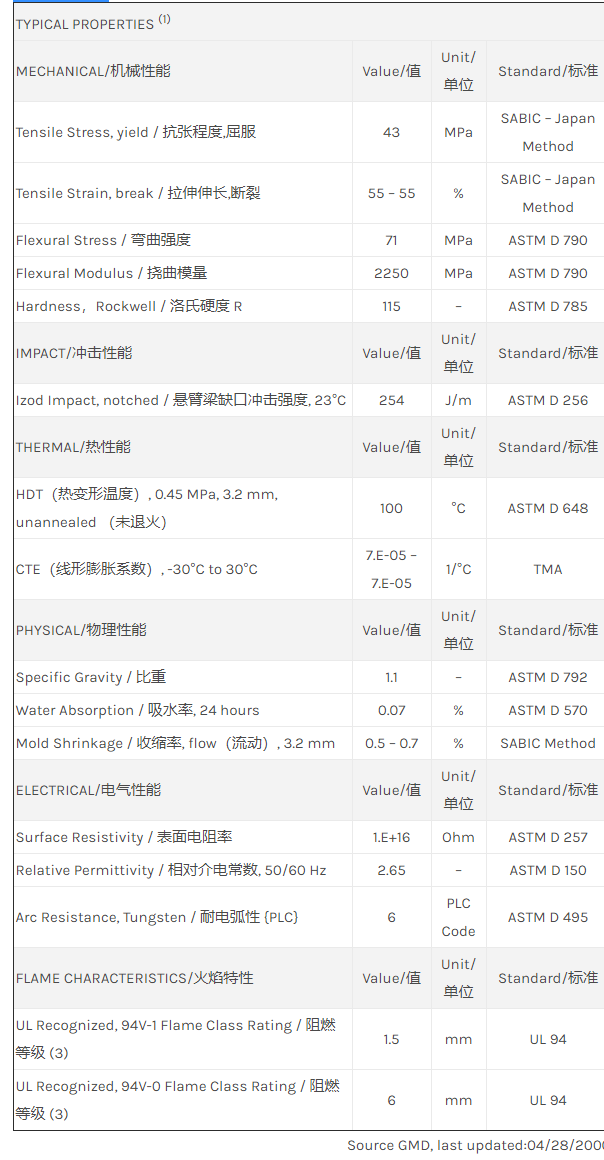 应用范围:产品描述Noryl PPO SE100P物性表相关颜色色号:SE100P-BK1066、SE100P-GY7E512、SE100P-WH7C062Property/特性