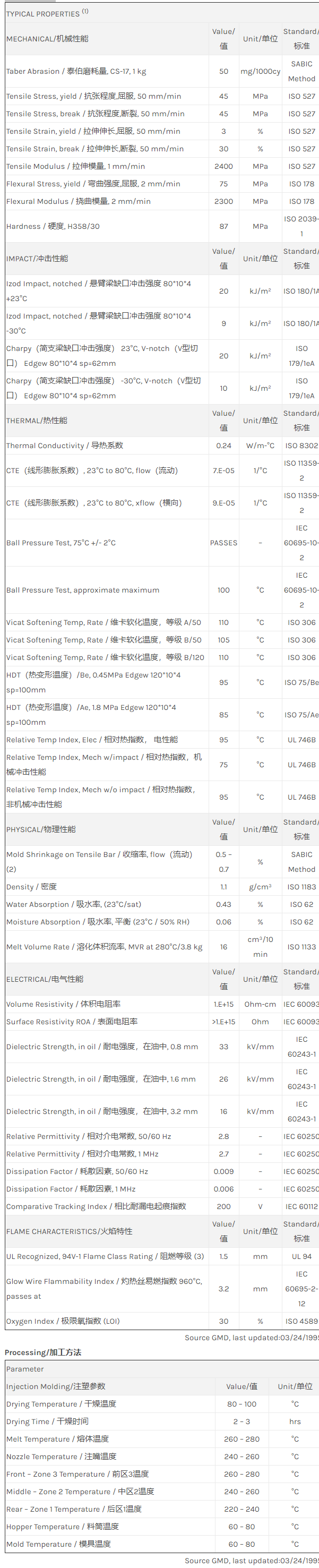 “NORYL SE90 resin是一种聚苯醚+PS(PPE+PS)材料,加工方式为:注射成型。
