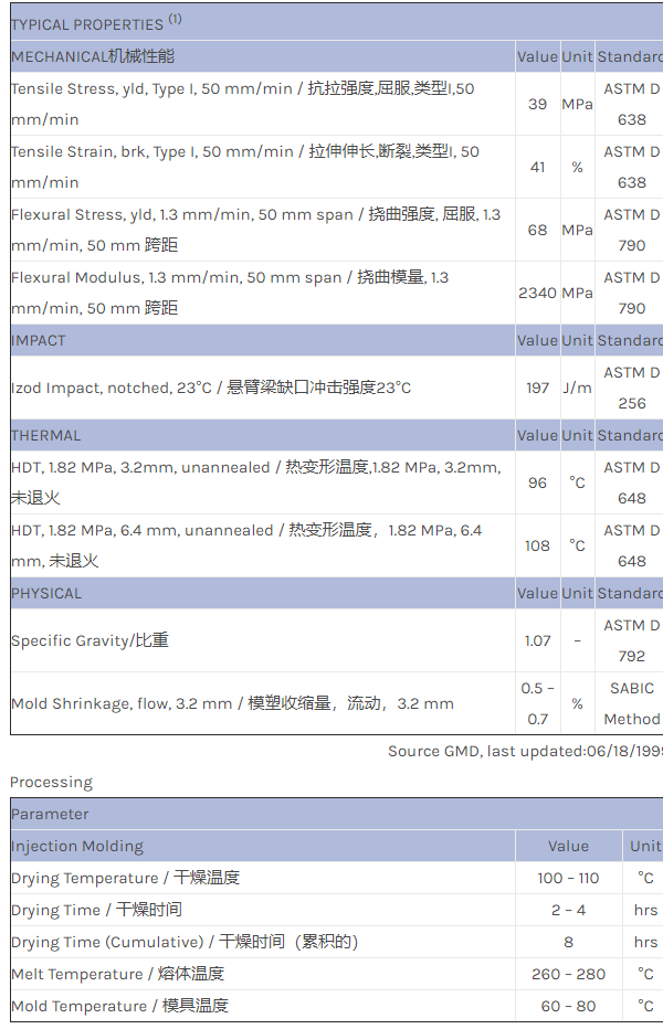 应用范围:产品描述NORYL PPO 844物性表Medium heat PPO/HIPS alloy used in the automotive industry.