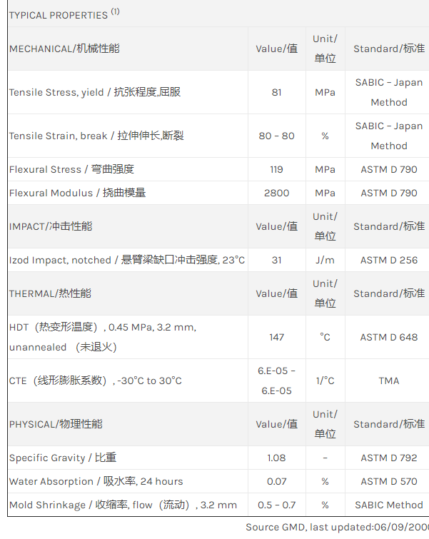 应用范围:产品描述Noryl PPO EFN4230物性表NORYL EFN4230 resin是一种聚苯醚+PS(PPE+PS)材料,主要特性为:耐热。Property/特性