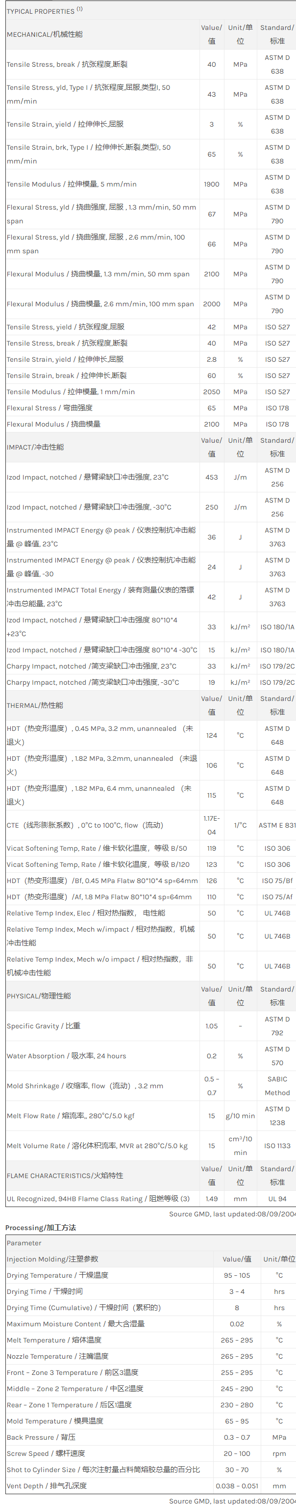 汽车内部件。改良的流动性、整体加工经济性。DTUL(载荷下挠曲温度):240F。 受热老化时,仍具有高抗冲击性,良好的性能稳定性。