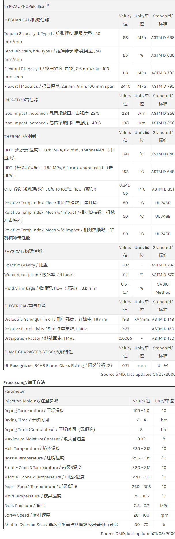 应用范围: 产品描述 Noryl PPO PX1391物性表 主要用于汽车应用。 优异的电气性能、耐高温。 DTUL(载荷下挠曲温度):305F (152C)。 PPE+PS blend. Unfilled. High heat. Dielectric strength. Dimensional stability. Suitable for E/E applications. Property/