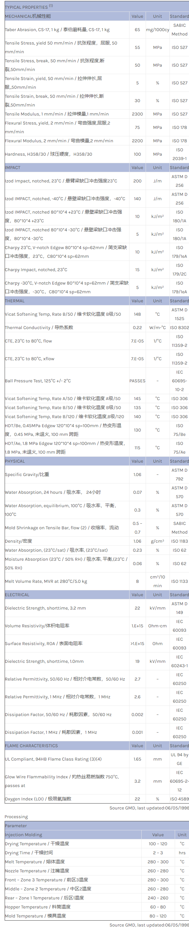 应用范围:产品描述NORYL PPO PX1104物性表NORYL PX1104 is an unreinforced grade offering a Vicat B/120 heat resistance of 140C according to ISO 306. Available in limited colors only.