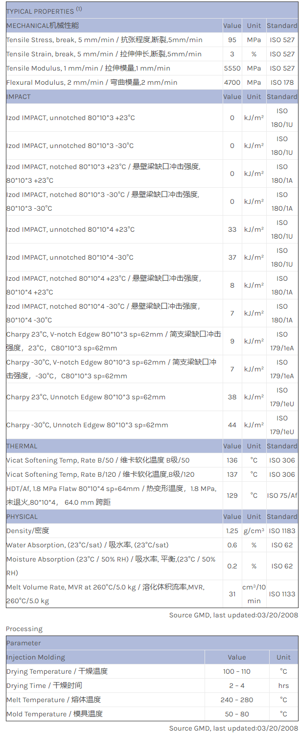 应用范围:产品描述CYCOLOY PC/ABS C4215HF物性表Cycoloy C4215HF is a 15% glass reinforced, non-FR PC+ABS grade with high heat resistance, excellent strength and rigidity with good cosmetic apprearance. It combines good