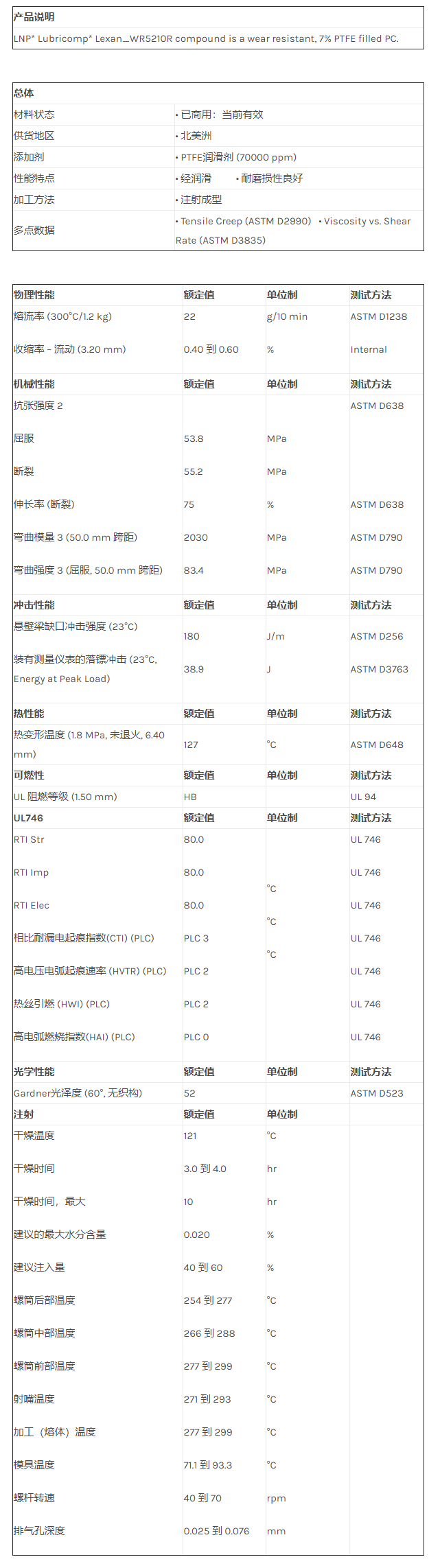 应用范围:产品描述LNP LUBRICOMP WR5210R物性表