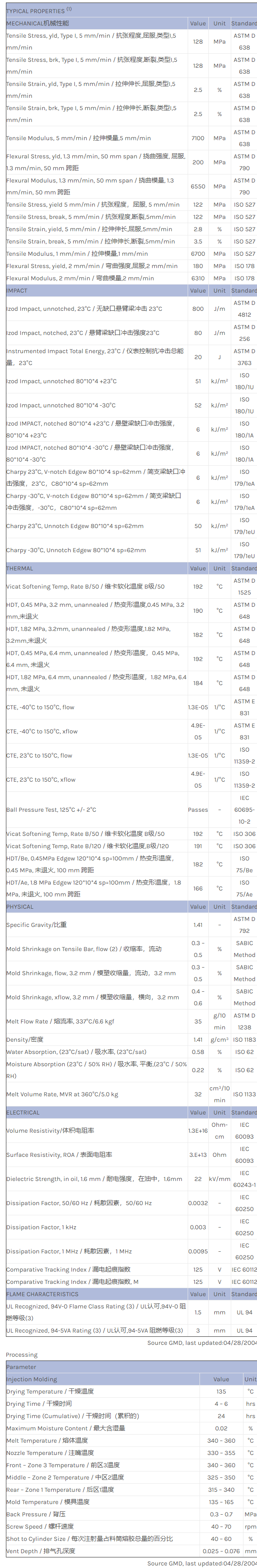 应用范围:产品描述ULTEM PEI ATX152R物性表20% Glass fiber filled, high flow Polyetherimide blend with internal mold release. ECO Conforming, UL94 V0 and 5VA listing.