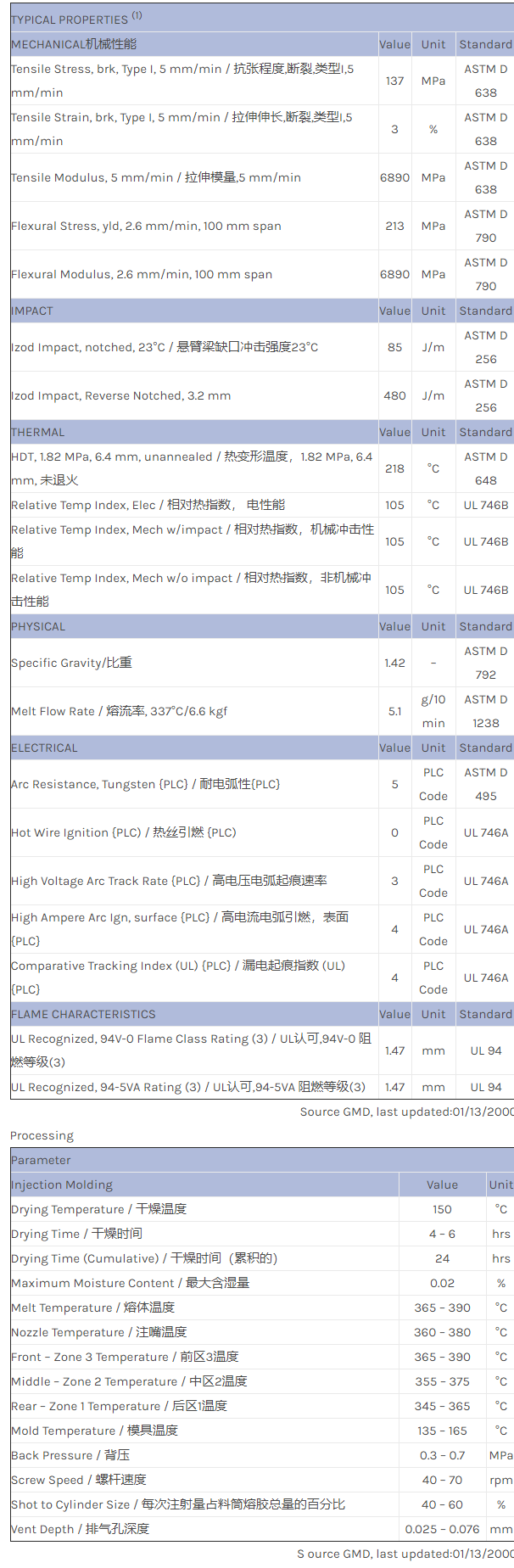 应用范围:产品描述ULTEM PEI CRS5211物性表20% 玻纤增强、低粘度共聚物。改良的耐化学剂性,耐强酸、碱、芳香族环烃、甲酮。