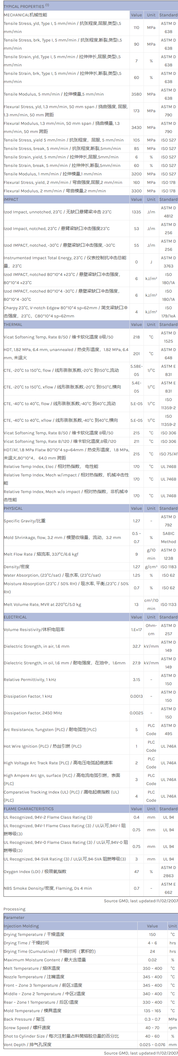 应用范围:产品描述ULTEM PEI 1000FV物性表Transparent, standard flow Polyetherimide (Tg 217C). ECO Conforming, UL94 V0 and 5VA listing; color dependant, see UL Yellow Card. US FDA and EU Food Contact Compliant, NSF 51 L