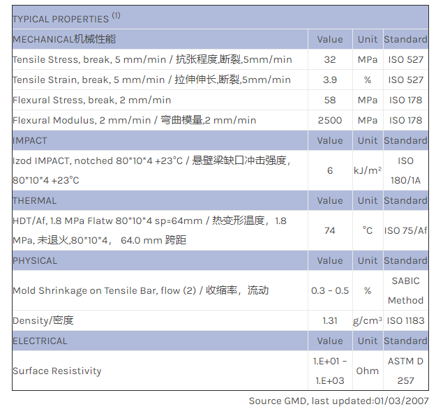 应用范围:产品描述LNP FARADEX AS0039物性表LNP* Faradex* AS0039 is a compound based on Acrylonitrile Butadiene Styrene resin containing Flame Retardant, Stainless Steel Fiber. Added features of this material include: E