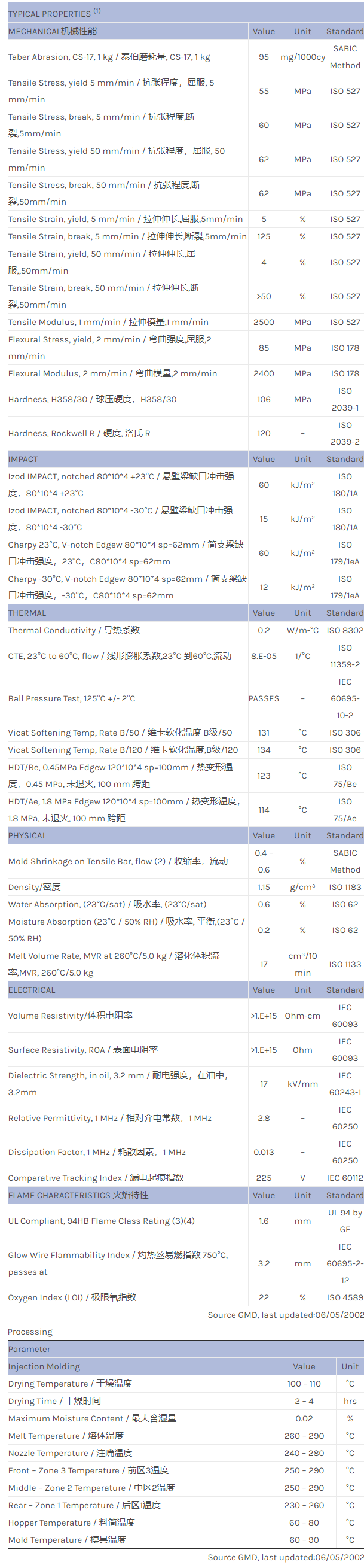 应用范围:产品描述Geloy ASA HRA170E物性表GELOY HRA170E is a high heat resistant ASA+PC. It shows high IMPACT retention, which can be positioned for various outdoor and indoor applications requiring superior heat aging