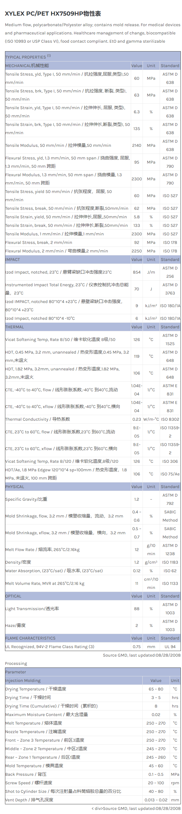 应用范围:产品描述XYLEX PC/PET HX7509HP物性表Medium flow, polycarbonate/Polyester alloy; contains mold release. For medical devices and pharmaceutical applications. Healthcare management of change, biocompatible (ISO