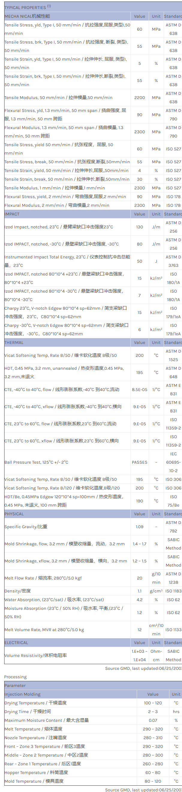 应用范围:产品描述NORYL GTX GTX973物性表NORYL GTX973 is a material especially designed for electrostatic painting and powder coating applications. The material combines high heat resistance with impact and conductivit