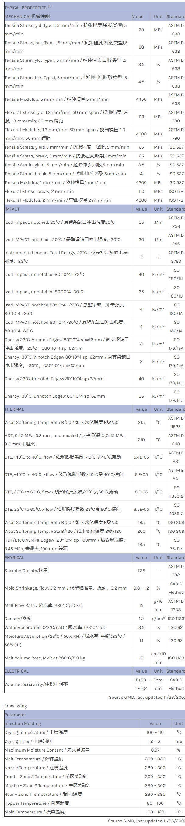应用范围:产品描述NORYL GTX GTX975物性表NORYL GTX975 is a 18% mineral filled material especially designed for in- or on-line painted exterior automotive trim part, e.g. tankflaps and corner panels. This material combi