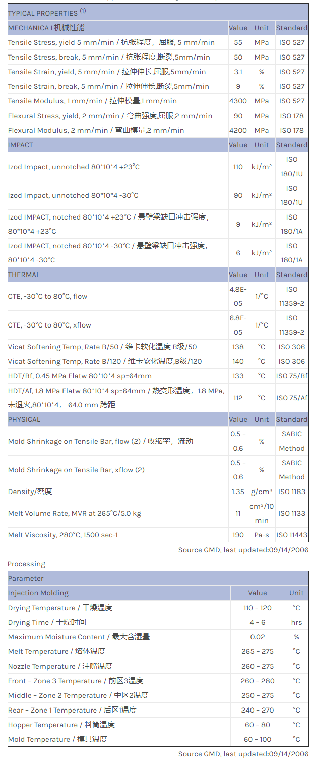应用范围:产品描述XENOY PC/PBT/PET EXXY0099物性表Mineral filled PC/PET blend with high heat dimensional stability, low shrinkage and low CTE for automotive exterior applications, like tailgates and spoilers.