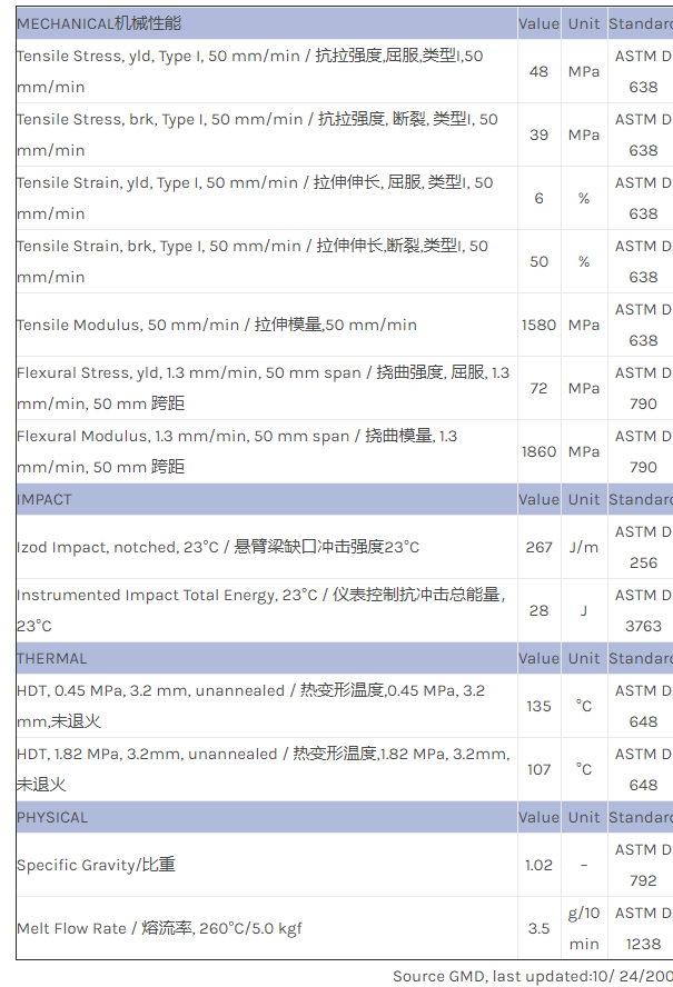 应用范围:产品描述NORYL PPX EXNP0007物性表Will be commercialized as PPX8145. PRELIMINARY DATA. High modulus, unfilled PPE+PP. Injection moldable and extrudable. FDA compliant.
