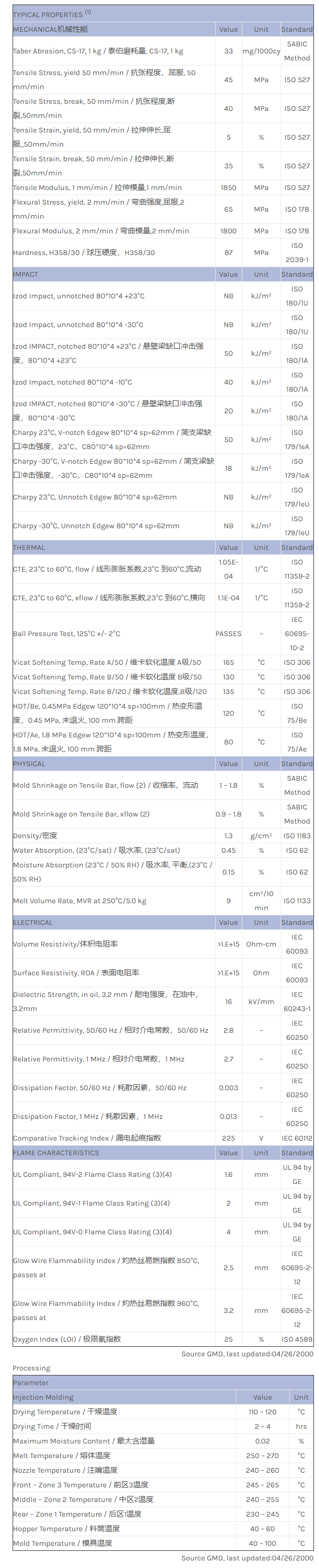 应用范围:产品描述Valox PBT VX3608C物性表VALOX VX3608C is an impact modified, flame retardant PBT+PC injection moulding resin. Application: electrical enclosures. This grade is 3607U with reduced oxygen index.